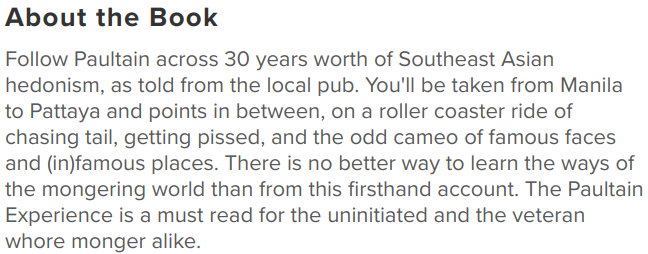 jeffs Posted October 15, 2022 Share Posted October 15, 2022 On 10/8/2022 at 9:14 AM, snoopdawg said: I only ever met Paultain online but I felt like I knew him; for me is the Godfather of Ladyboy Mongering. Back in 2011 I was a member of a lot off different boards as I prepared for my first trip to Pattaya (which would also be my first solo trip) and I my third to Thailand. At that time I was only dabbling in the dark side but two BM's stood out amongst their peers as they were openly posting their LB experiences on the mainstream boards (Pattaya addicts etc). One of those was Alaskan Bear and the other was the legendary Paultain. He introduced me to LBP where his Trip Reports stood out amongst everyone elses as they weren't just a clinical list of conquests and fucks but real adventures, mixing mongering with mainstream activities. His ethos became something I would try to emulate and he was kind enough to write me a detailed guide that I'll post below. I picked up his self-published book - it used to be on sale in Cantebury Tales and all profits he gave to a Thai orphanage - and although the writing was lacking in professionalism and truthfully the printed word is not a good a format at Boards / Blogs (that allow different media to be inserted) it was still an entertaining read. I got the impression that his was a life well lived and I'm sad that I never got to meet him in person; a light that burns twice as bright burns half as long. The Paul Tain Experience a great read for any monger young or old , i actually bought my copy from the Canterbury Tales . Pictures of book and three more classics from my library . 2 Link to comment Share on other sites More sharing options...